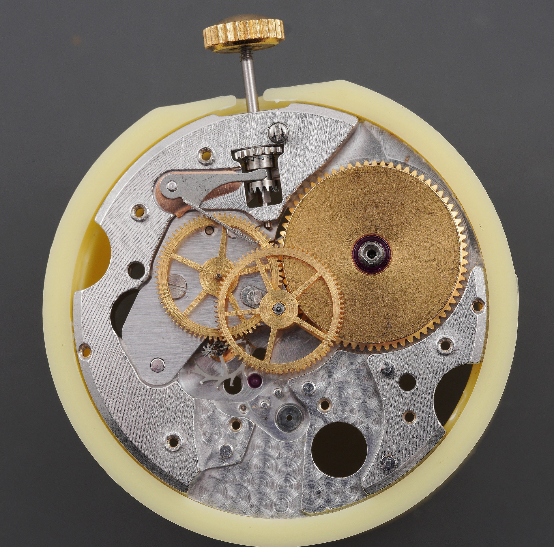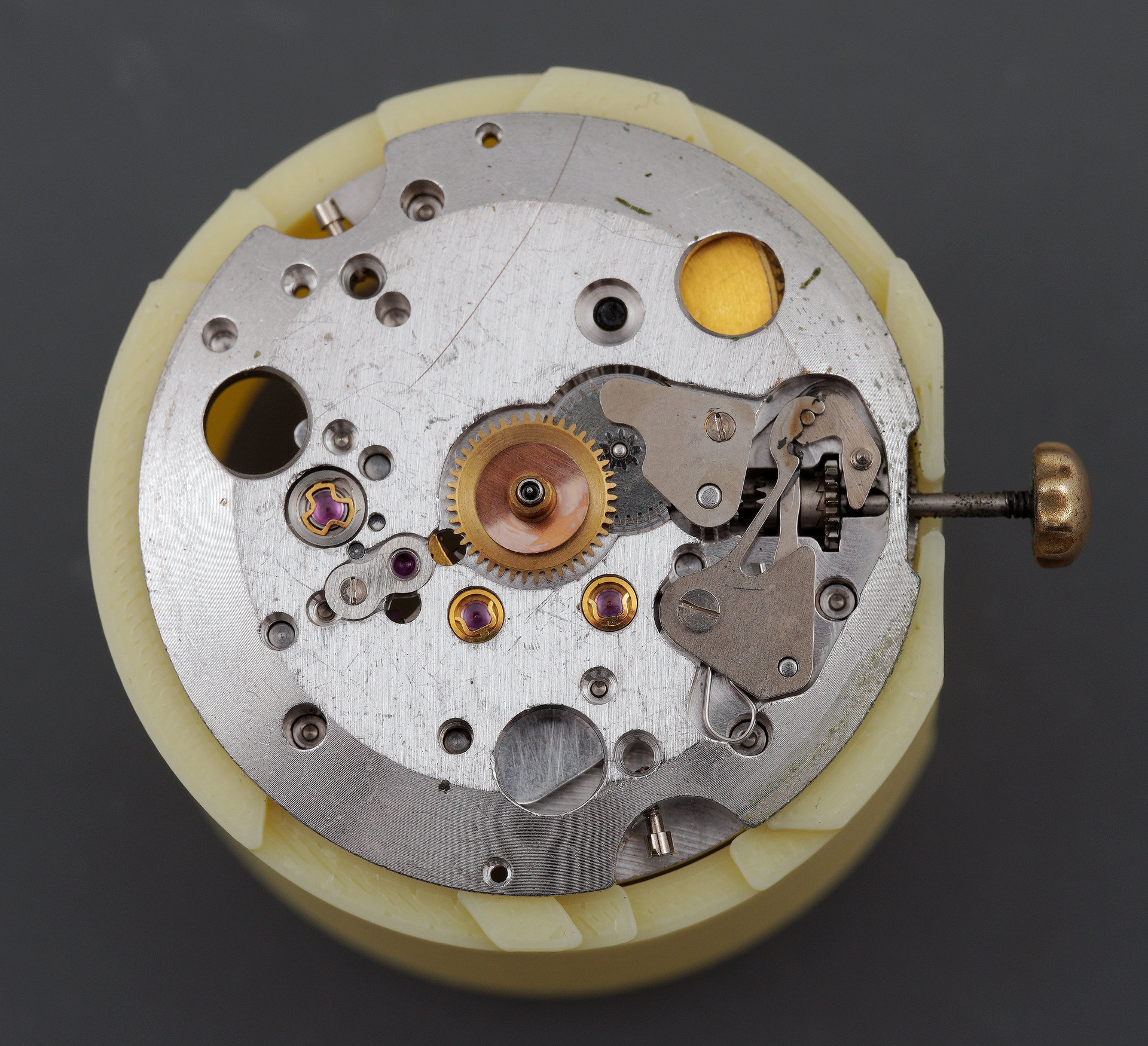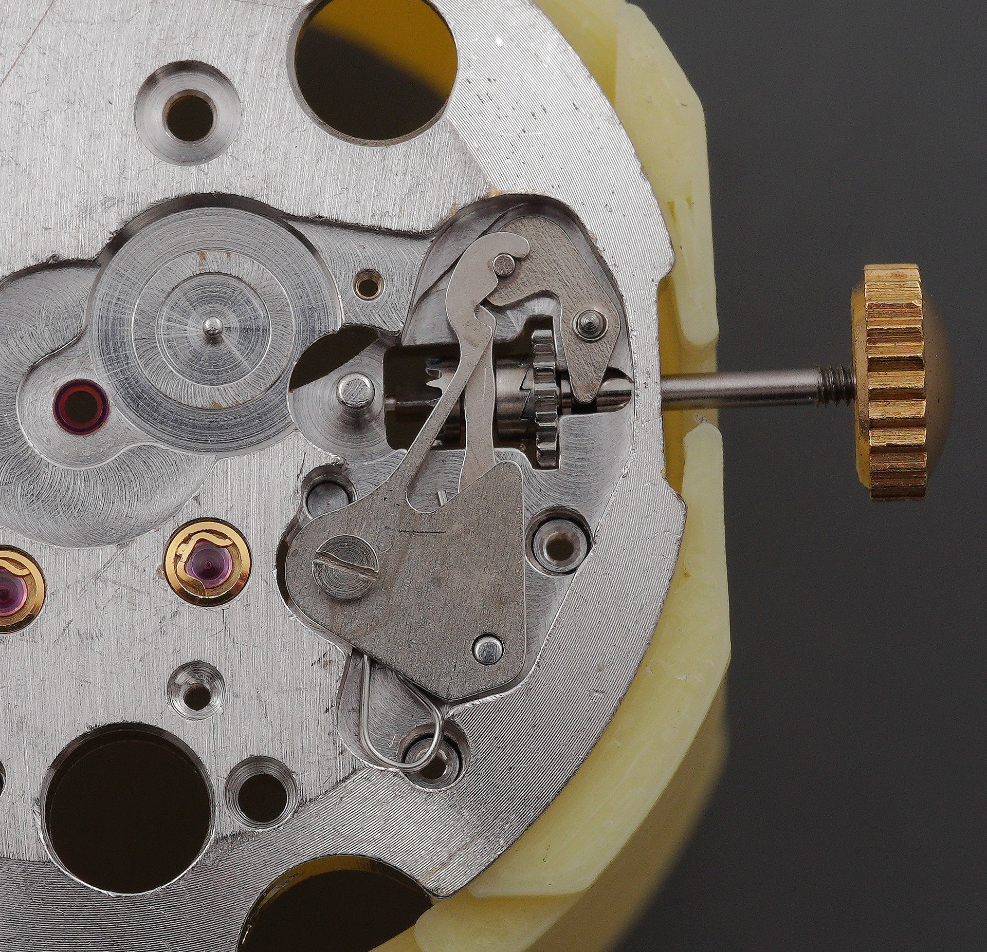 With a nicely greased gasket, the crown and stem can be fitted to the watch and we can survey the movement in situ.