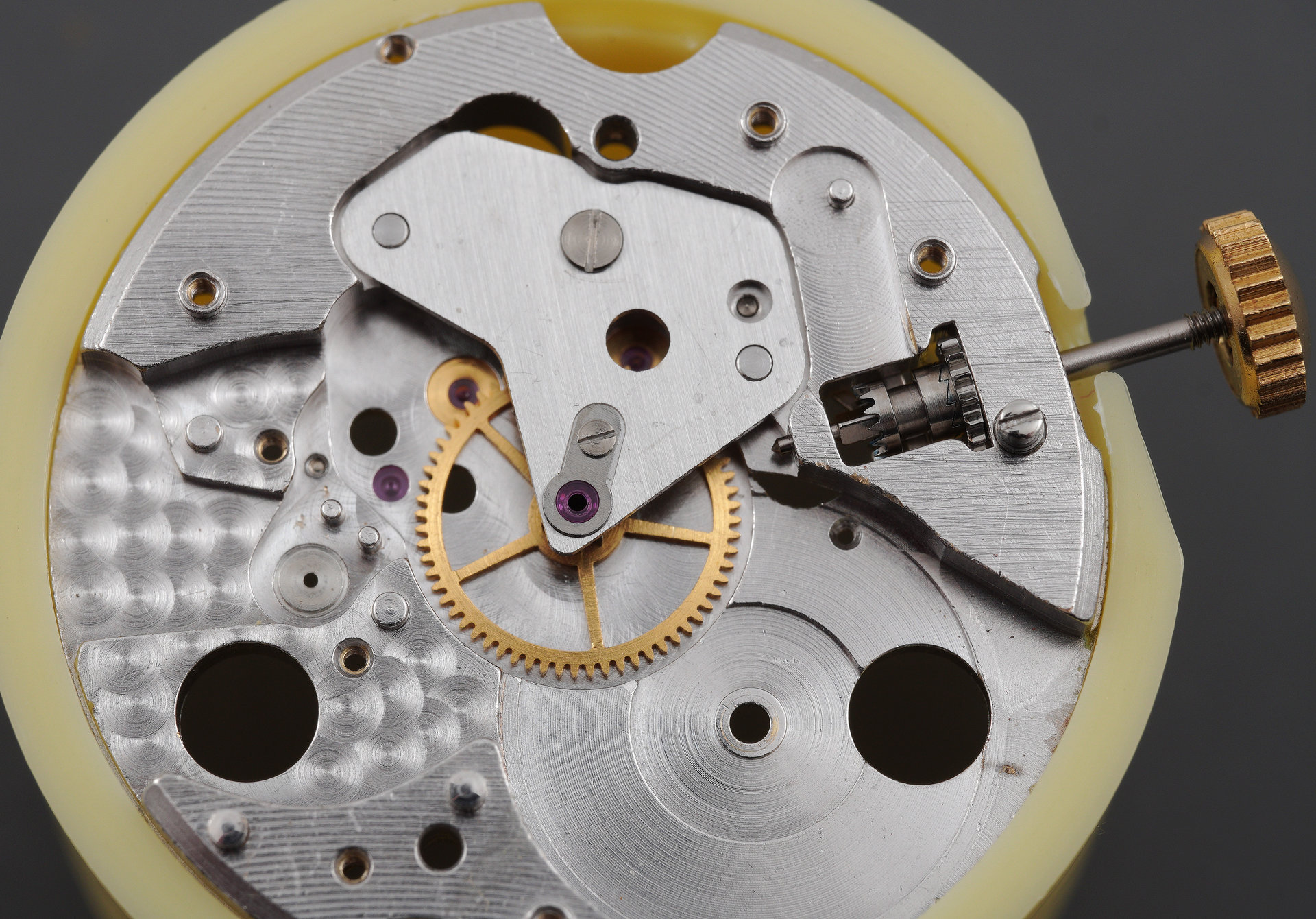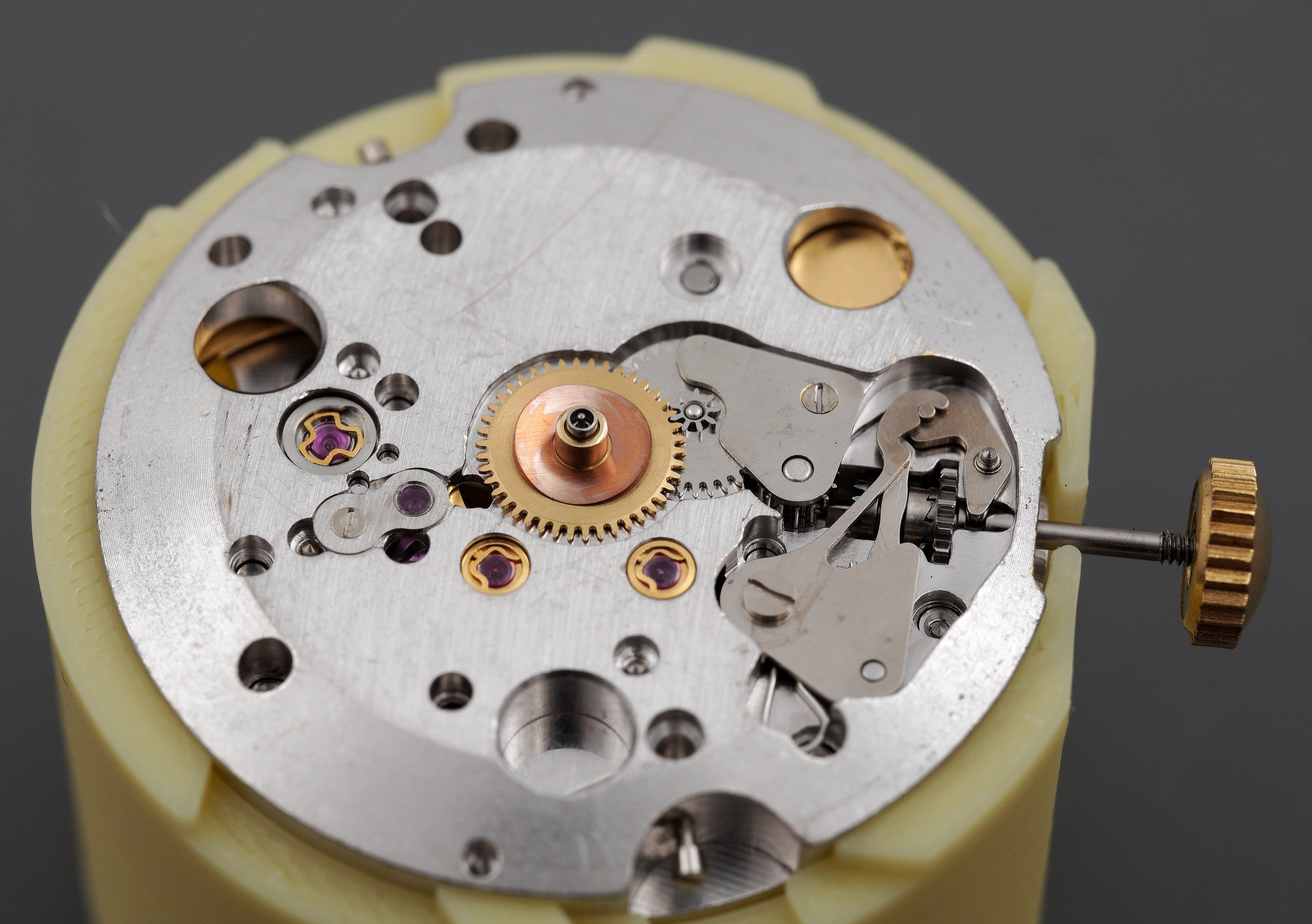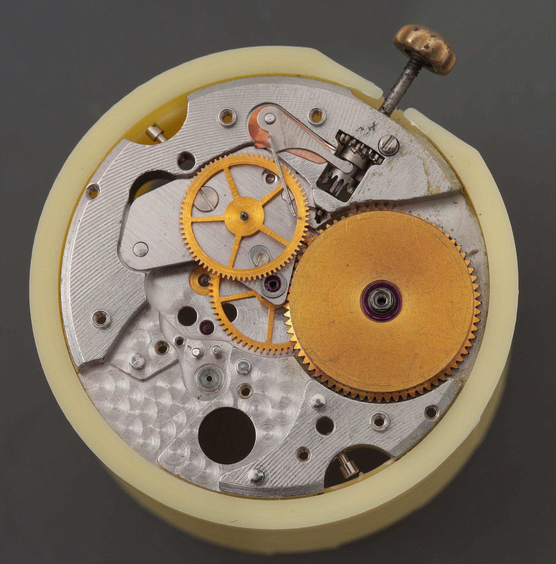 With a nicely greased gasket, the crown and stem can be fitted to the watch and we can survey the movement in situ.