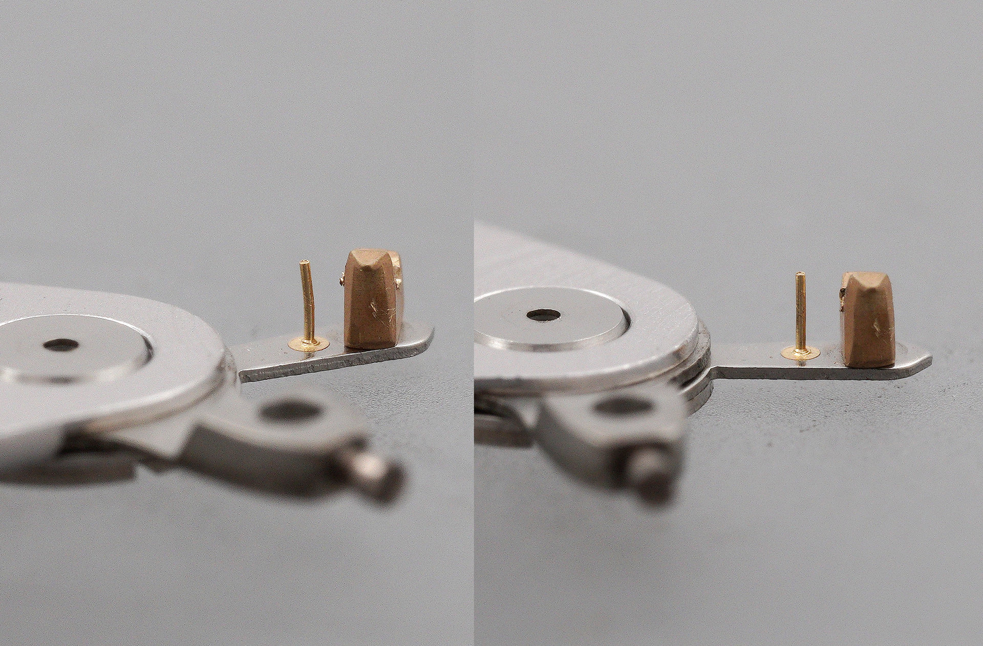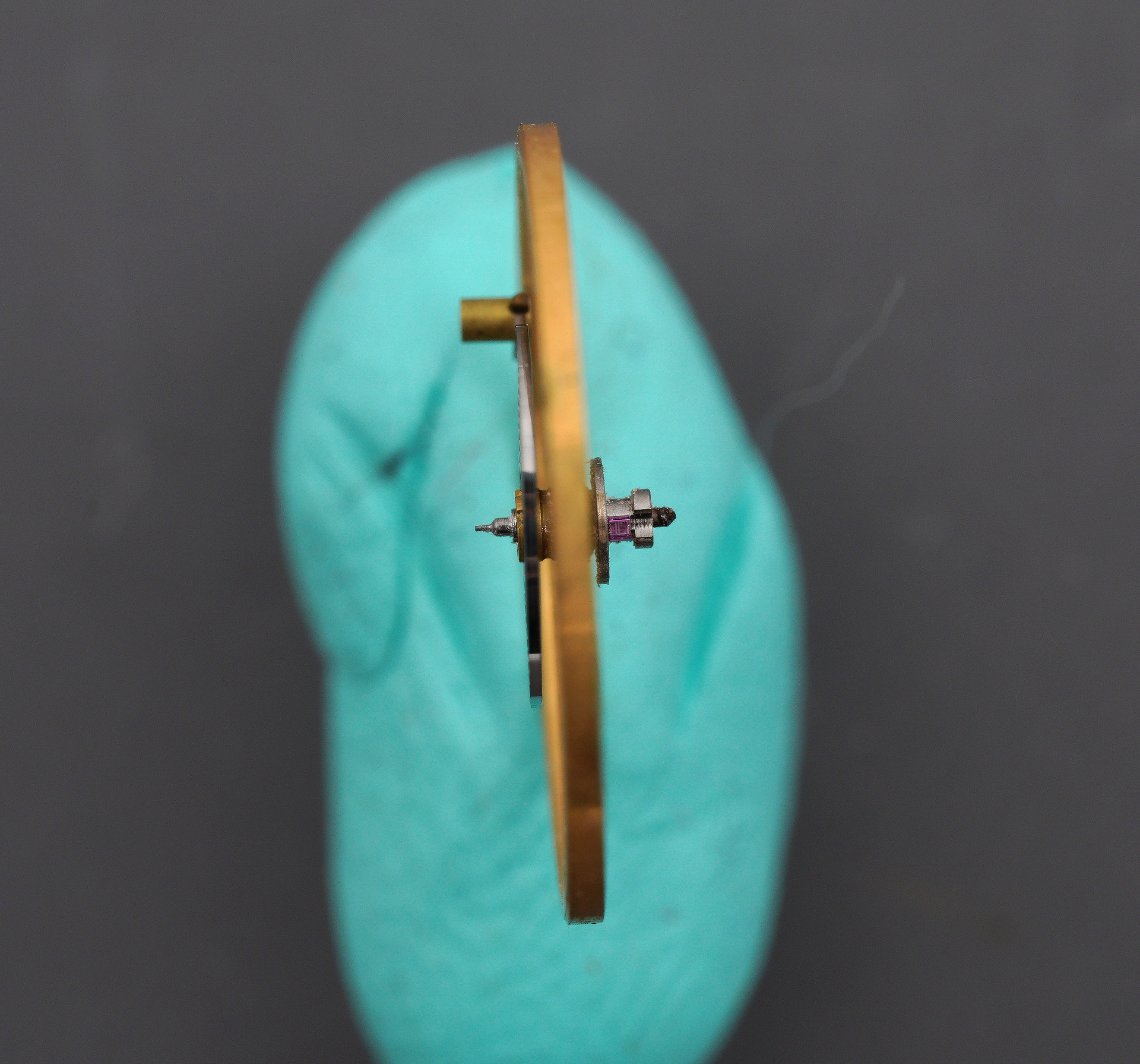 The pallet fork finds its home, a little more restricted than before with one of the two banking pins standing a more upright, and then secured by its bridge.