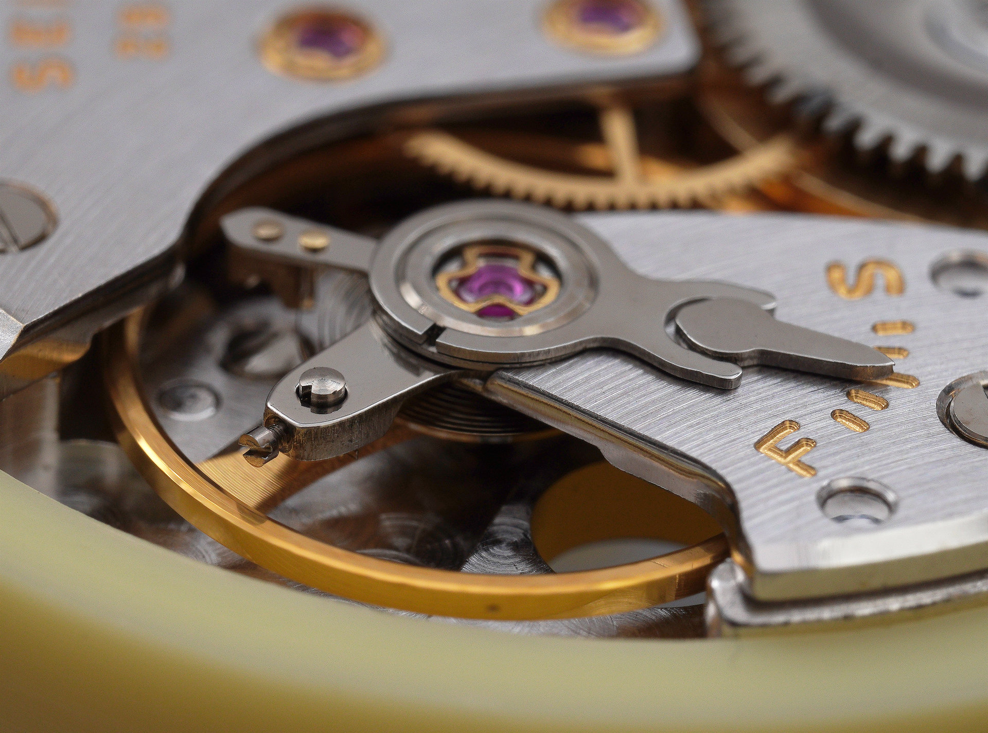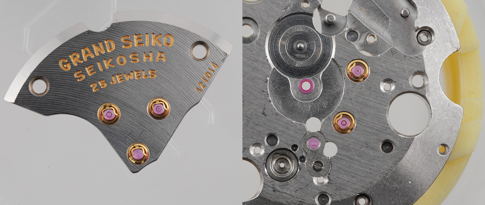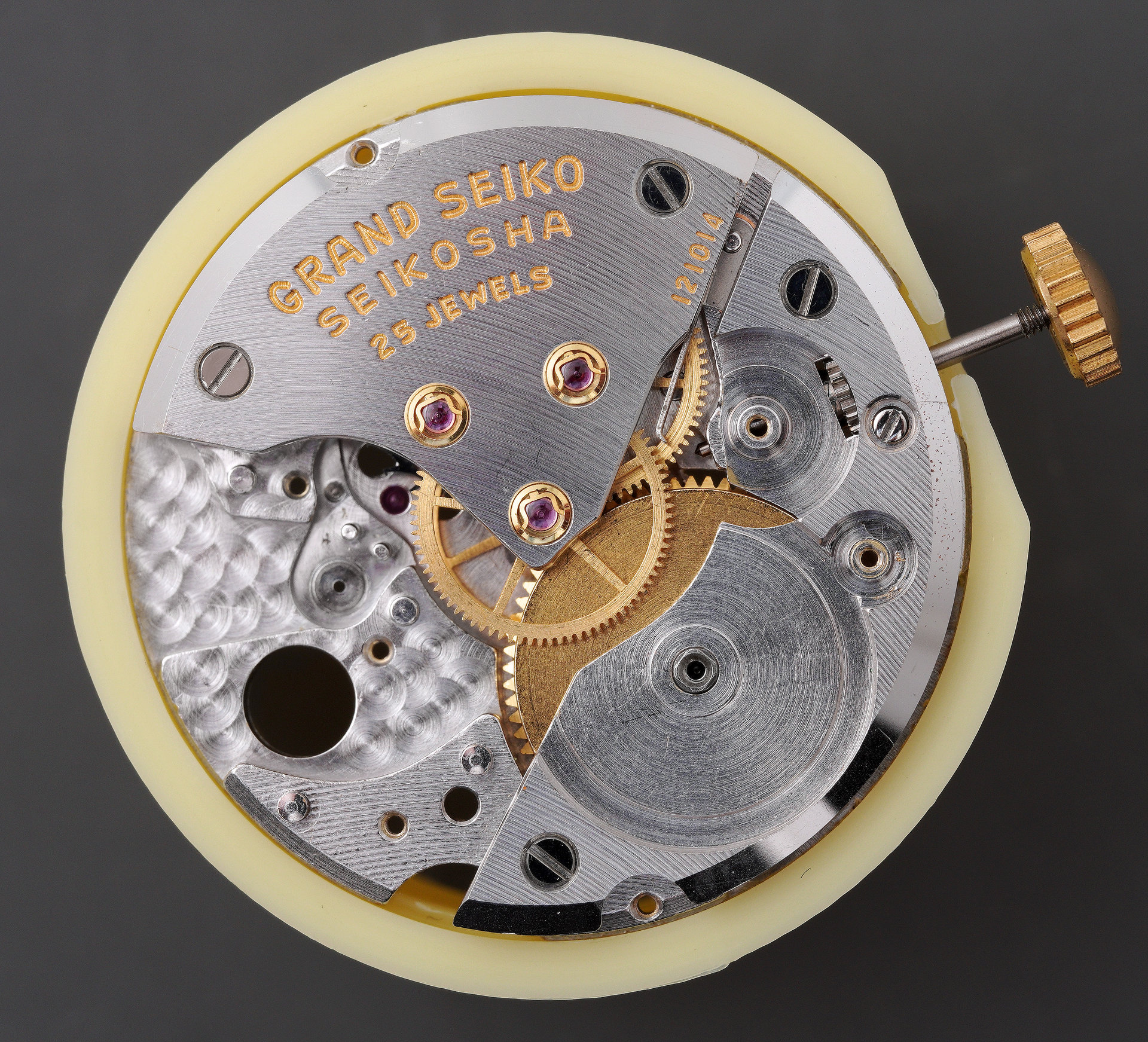 Removing the dial presents us with the layout of the dial-side of the movement. Everything looks present and correct, with the grease around the setting lever clearly showing its age. Where the Lord Marvel used three jewelled end-piece plates to protect the pallet fork, escape wheel and third wheel pivots from contamination, in the Grand Seiko movement, the latter two are replaced by Diafix settings, with the end-piece preserved only for the pallet fork pivot.