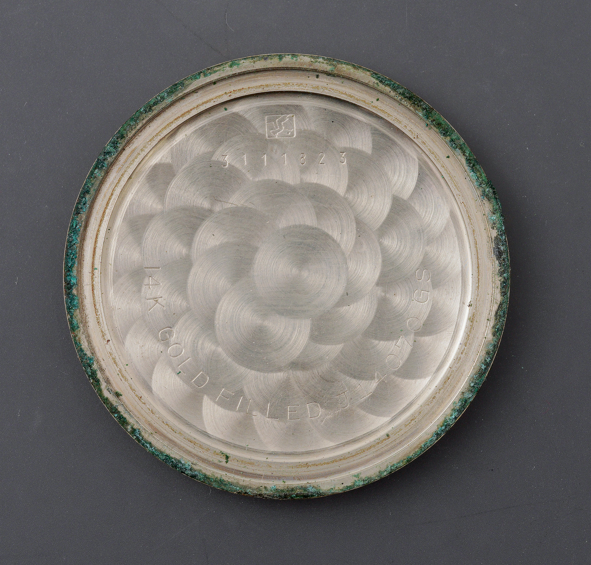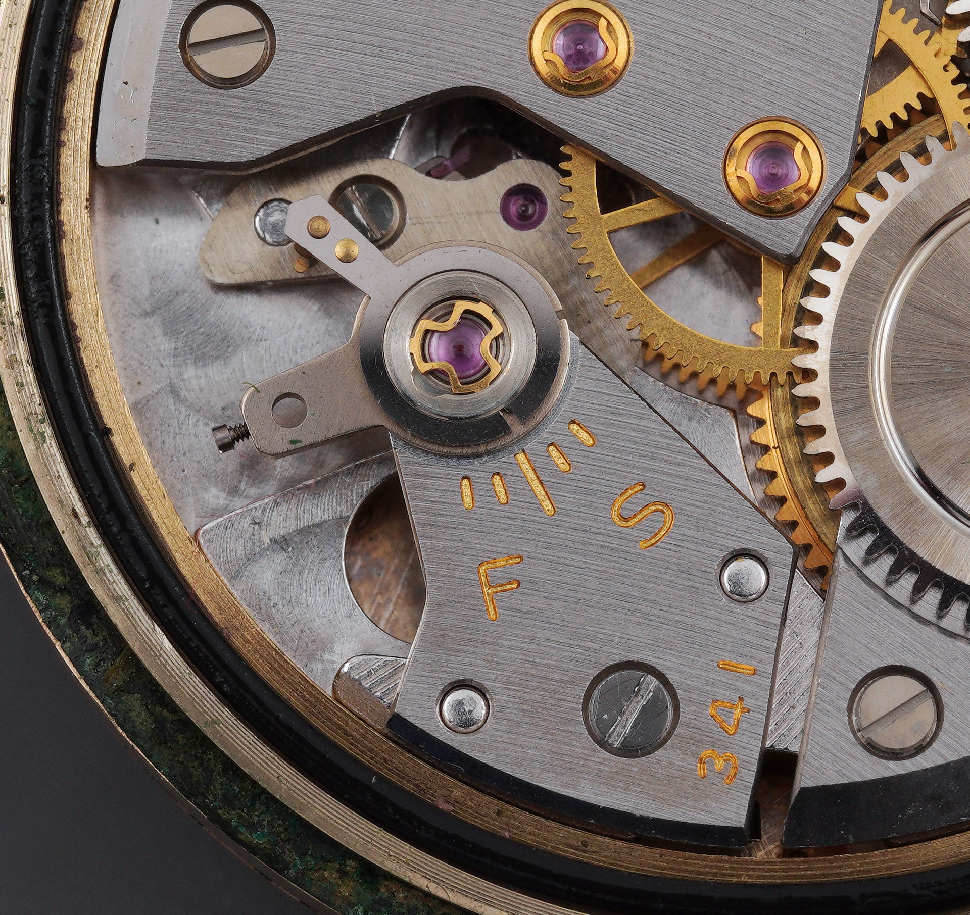This is a lovely, somewhat gently-patinated example of the most common dial variant, the SD raised logo, with its most obvious flaw, the likely water-initiated reaction between the 4-marker and the base metal beneath the dial lacquer. The print though is in beautiful condition, crisp and complete. Removing the movement provides a view of the chain of evidence that permits a plausible reconstruction of the cause of the dial issue.