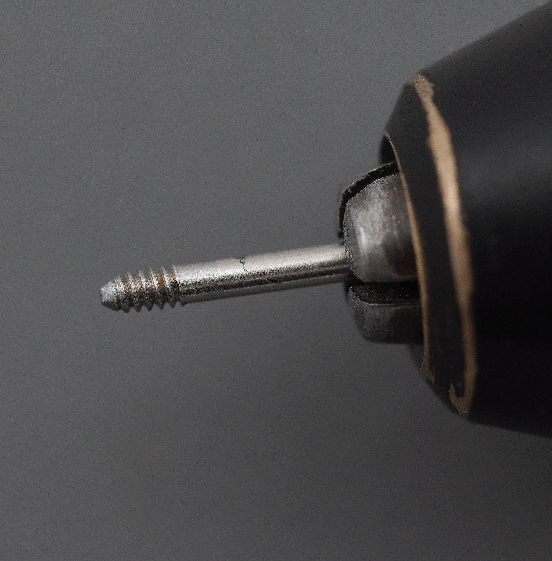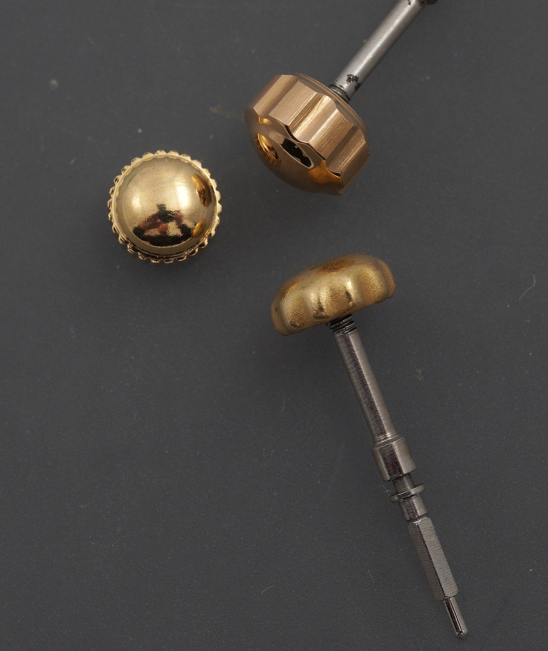 The coarse-knurled crown is a Tap 9 x Ø 4.50mm x 2.00 mm Maserati style from Cousins catalogue; the finer knurled example is a Tap 9 x 4.0mm x 2.00mm round-headed crown. Either of these would do the trick although the Maserati-style crown is clearly a little too deep to pass off as a facsimile of the original. Nevertheless, it is that one which I ended up choosing (although I now think perhaps that I should have gone with the one, top left). For either selection to work however, I would need to make some adjustments to the stem. To that end, I sourced a replacement stem and carefully reprofiled the business end.