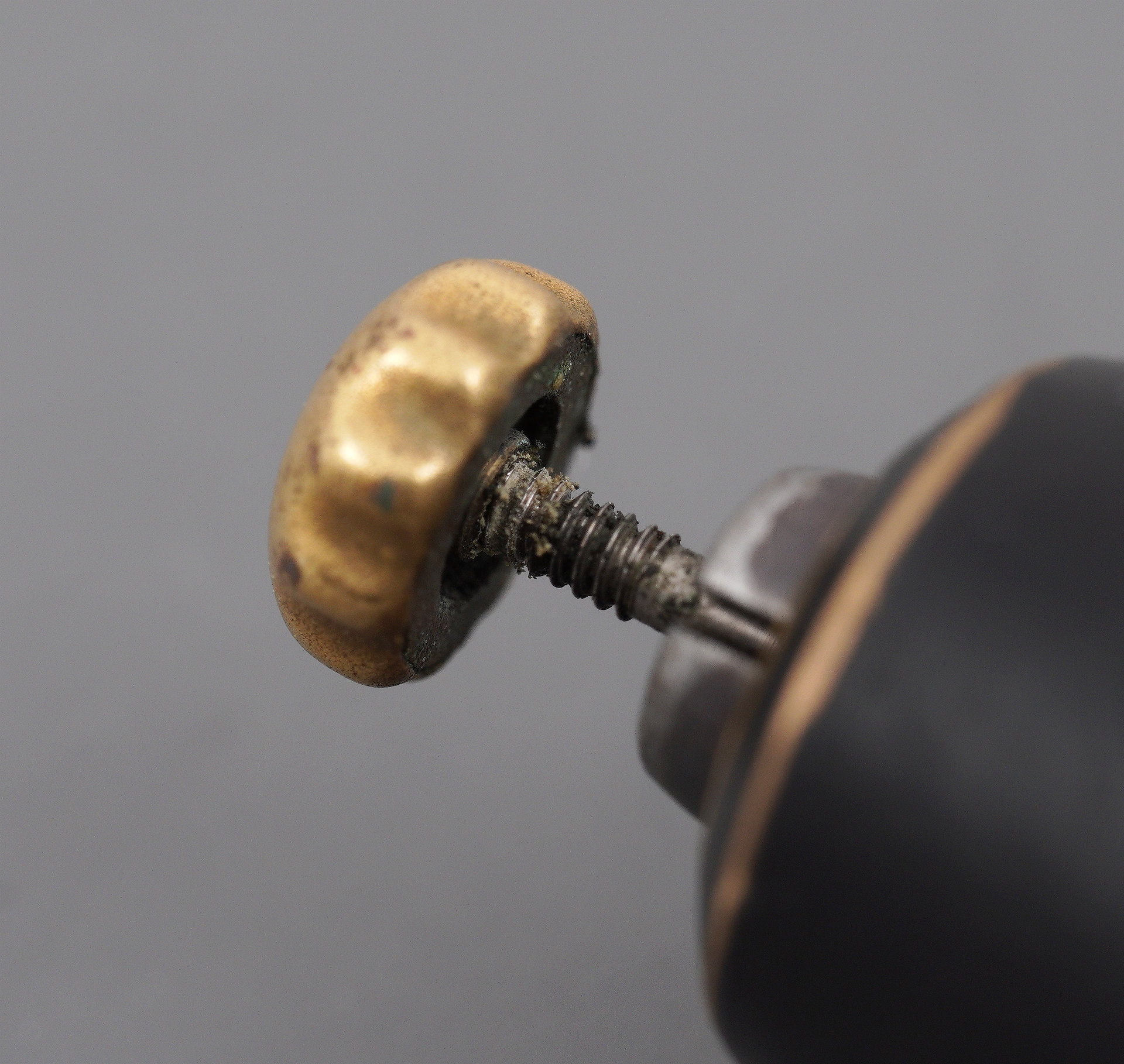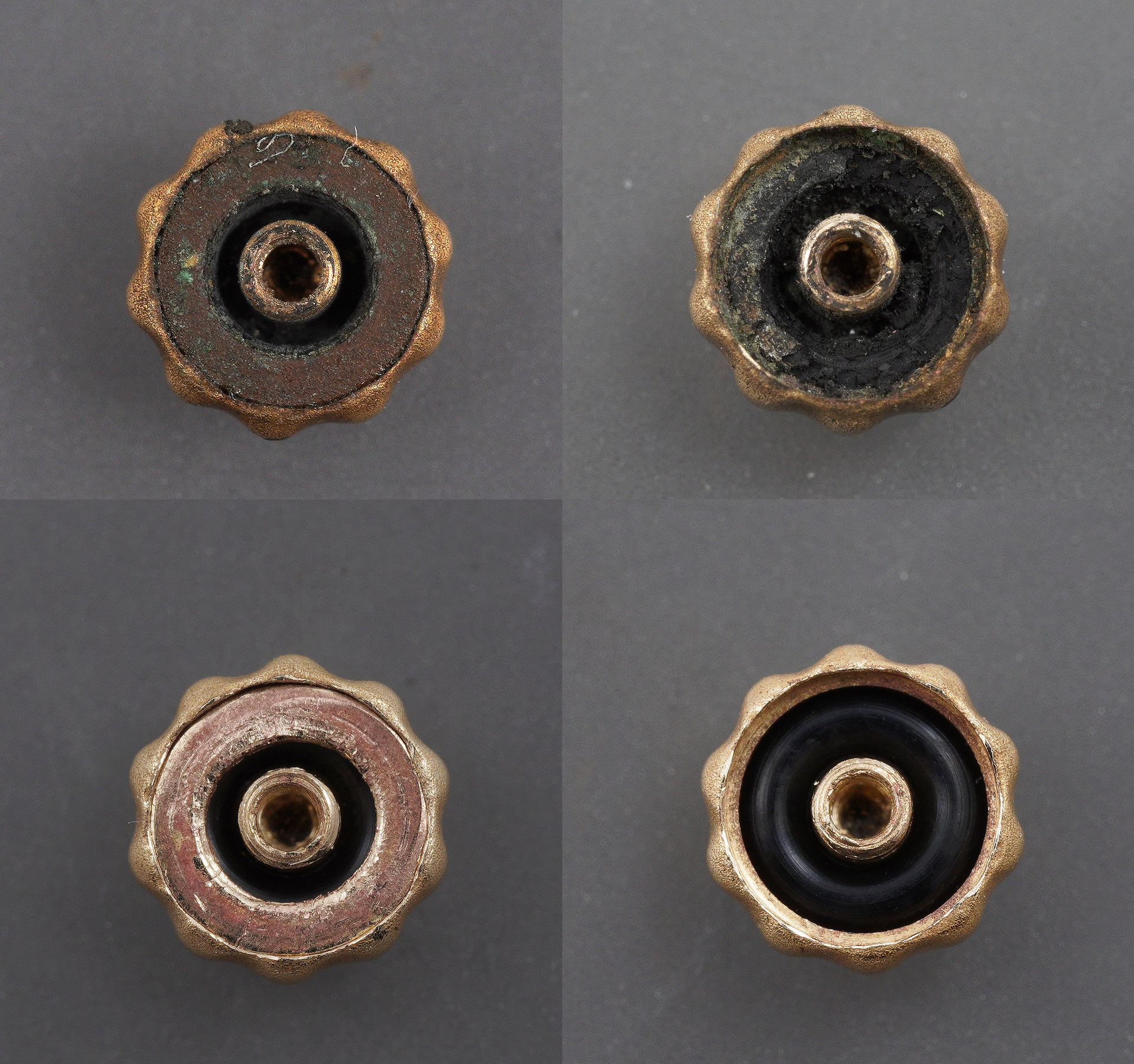 As you may see from this grungy photo, the crown features a captured gasket sitting behind a staked washer. In order to restore the crown therefore, the washer and crown innards needed to be extracted before cleaning and installing a replacement gasket, topped off by the refitted washer. That process is summarised as follows: