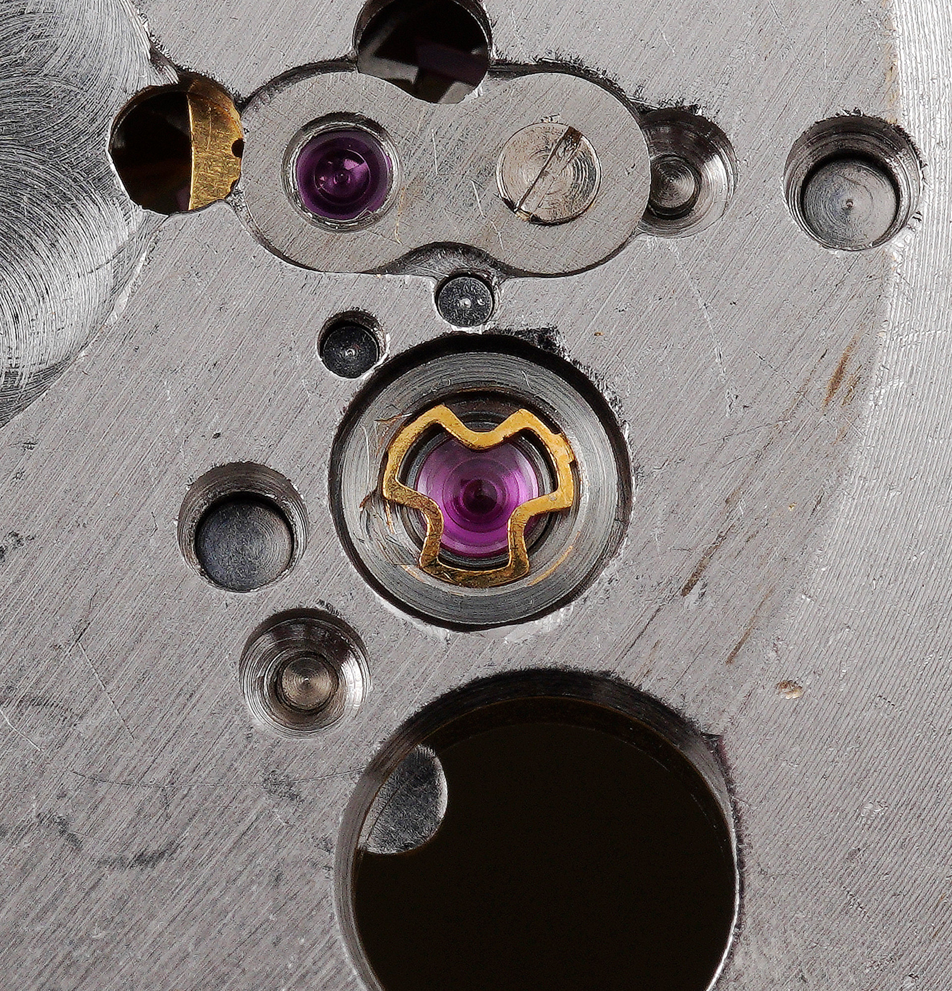 We note at this point that the barrel arbor holes in the barrel bridge (and the mainplate) are unjewelled, the designers favouring a fully jewelled barrel.