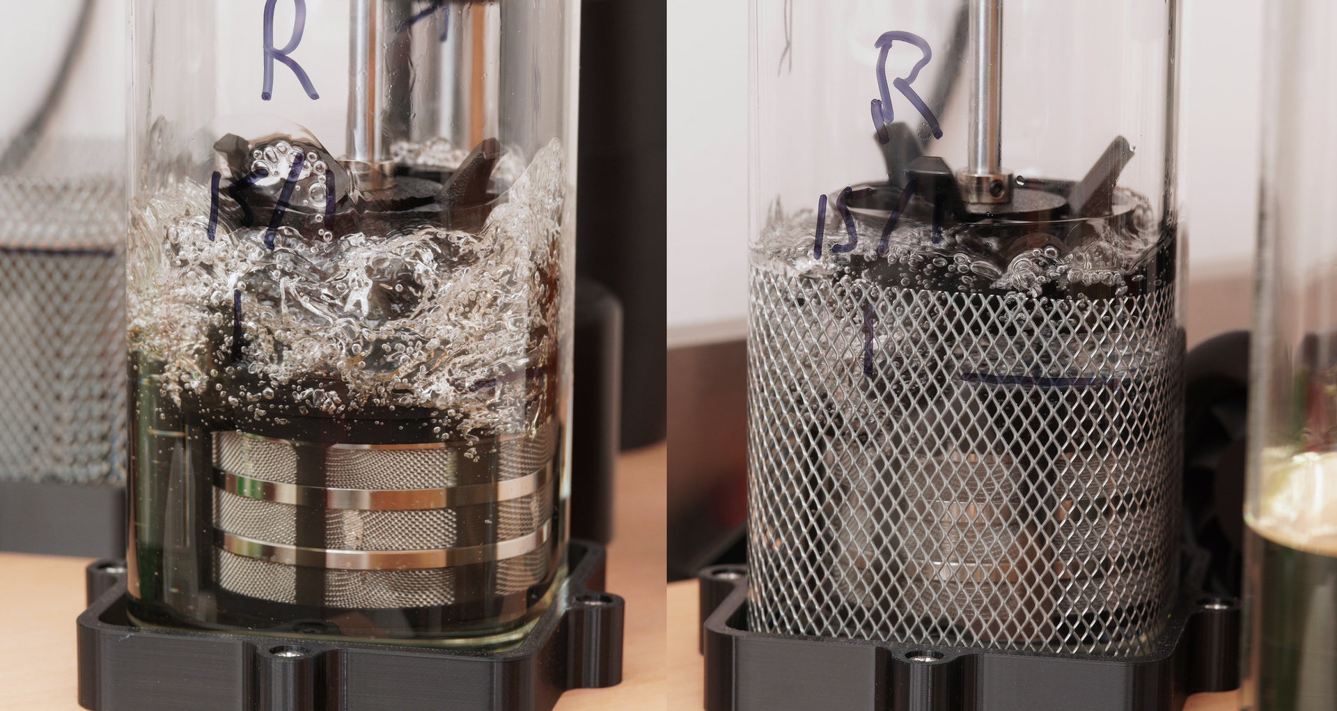 I have been experimenting with the settings on my watch cleaning machine and one thing that I’d wanted to try was installing wave-breaking mesh in the jars to reduce aeration of the solution during the cleaning and rinse cycles. You can see the effect (perhaps) in these two photos, the jar on the left without mesh and the one on the right with.