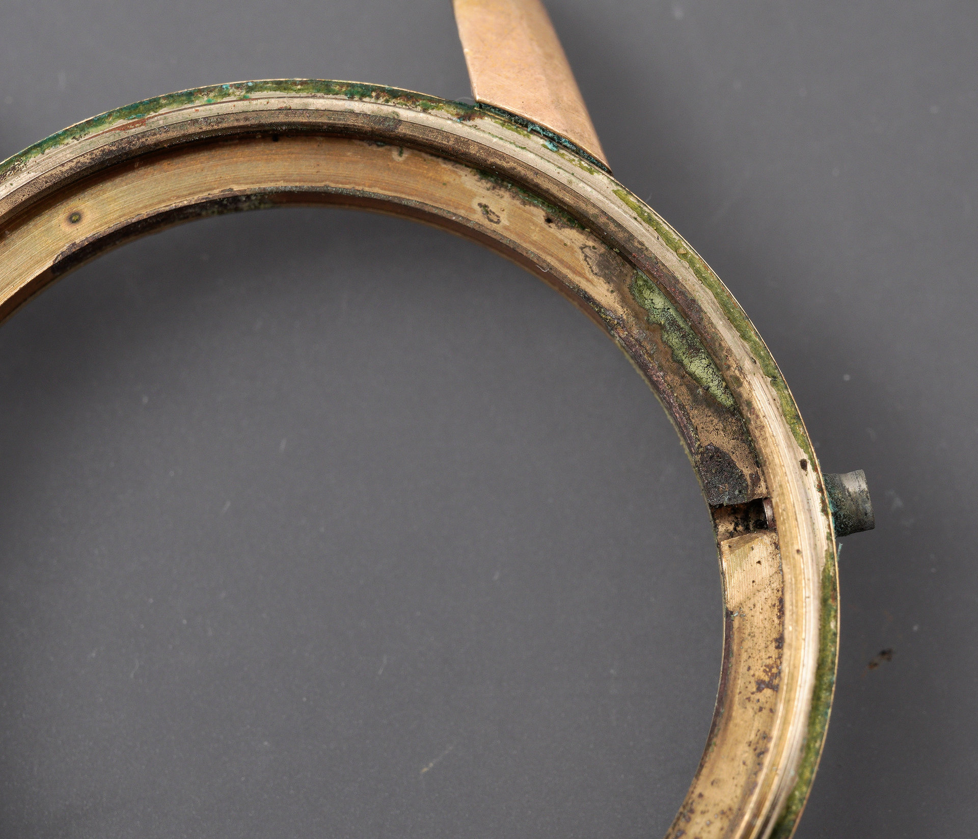 The verdigris growth on the lip of the case in the region of the crown tube indicates historic water entry, most likely the result of the crown gasket hardening with age. The position of the corrosion in the region of the 2-marker though is inconsistent with the dial issue at 4 but sometimes the point of entry is not always the location at which the most damage is wrought.