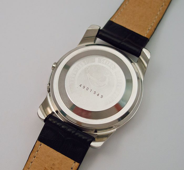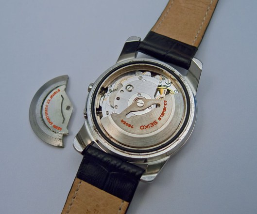 The 7606A is a 23 jewel automatic, with day/date complications and a quickset date feature, operated using a push button located at 3 o’clock position to the crown’s 4 o’clock. It is this feature that marks this one as out of the ordinary and makes the watch just that bit more distinctive than many of the other Seiko dress watches from this period. The case has considerable presence, with square, bold lugs, a very attractive dial/handset, a wide indexed chapter ring and a very large acrylic crystal. The one I found looked presentable but with an inoperable day complication, stuck half-way between Wednesday and Thursday and a sticky half-functioning date quickset. The case back on this one is a press-fit, snap-on type, requiring a proper tool with a thin but blunt blade to prise it open without risk of damage. Once open, we can see what lurks beneath: