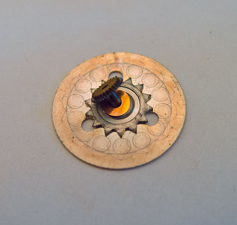 taking the hour wheel and film washer with it. Note the angry looking star of teeth sitting on its underside. With the hour wheel back in place we can take a proper look under the hood at the calendar mechanism and see how that simultaneous day/date change works.