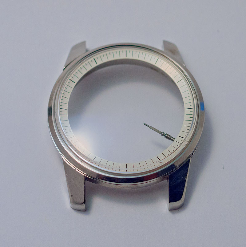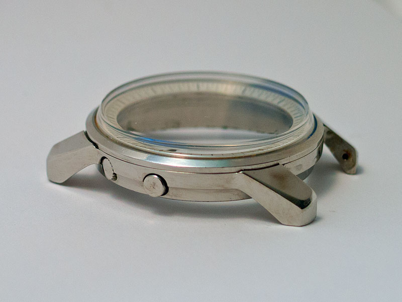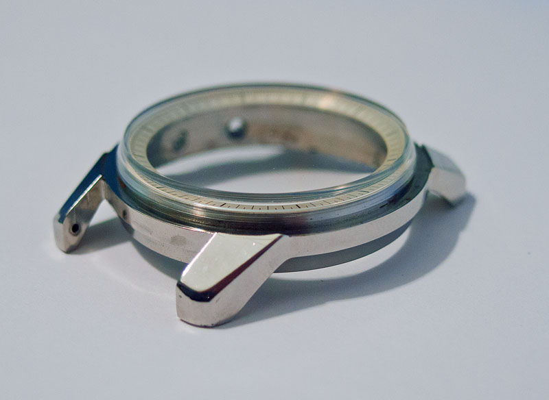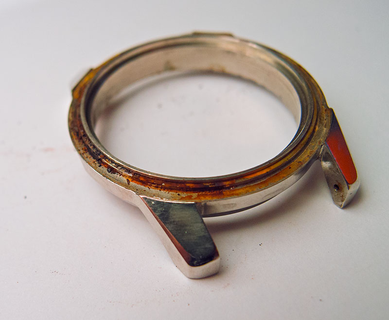 Note that only the escape wheel merits a Diafix on the third wheel bridge, the third wheel pivot making do with an ordinary jeweled bearing. Next, as usual at this point, we turn our attention to the case, which pre-makeover looks grim: