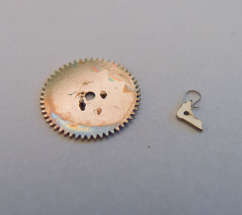 Continuing to dismantle the movement, but still focussing for the moment on the day driving wheel, we get a good idea just how complex and nicely engineered these older movements are. Removing the solid day finger, we get a look at the separate date finger which is sprung and can move about a pivot sitting at its elbow, allowing a more progressive day changeover with the force gradually building as the wheel advances until the resistance provided by the date jumper is overcome. In operation the day starts to change a little before any action is perceptable from the date.