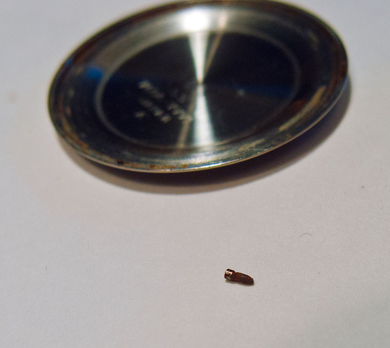 Clearly, pretty grubby in there, some rust, and a foreign body sitting bold as you like on the rotor, which itself appears to be coming apart at the seams. A better view of the stray part suggests a badly rusted screw, its origin not yet clear but it looks like one of the dial retaining screws.