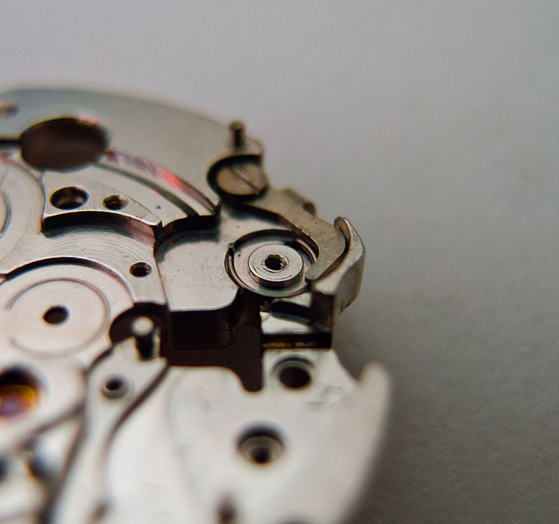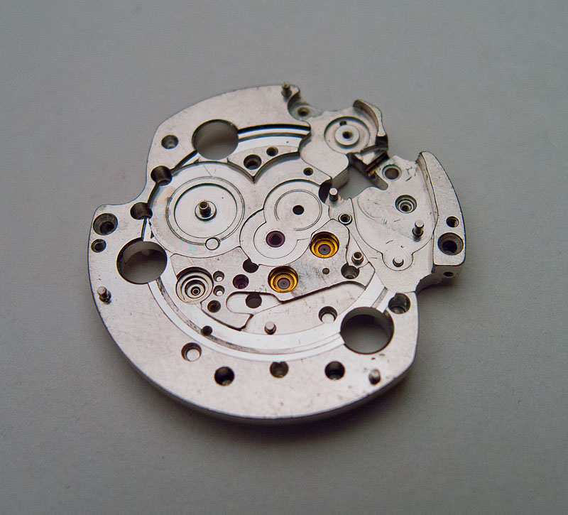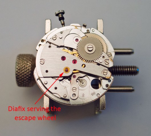 One parting shot from this side shows two of the Diafix jewel holes with springs and cap jewels removed (an operation considerably fiddlier than for Diashock jewels, which themselves take some practice dissembling and reassembling). The two Diafixes are used as bearings for the third wheel and escape wheel.