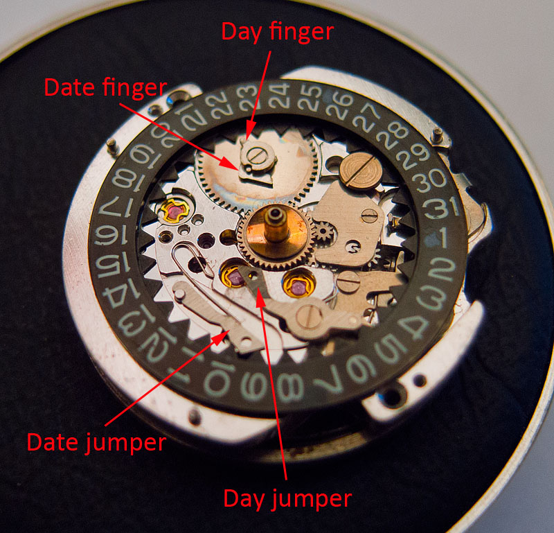The key to the day/date changeover is the date driving wheel on which sits the date finger and day finger (indicated above). The date driving wheel is itself driven by the hour wheel (centre), two revolutions of which turns the day driving wheel through 360 degrees. As it turns, the day finger engages with the teeth on the underside of the day wheel (see preceding photo) slowly turning it clockwise whilst the day jumper slots into position between two of the teeth, ensuring that the day aligns correctly with the date, once that has changed too, and holding it in position until the next changeover. Meanwhile, the date finger, which points in the opposite direction, starts to engage with the teeth on inner diameter of the date disk, turning it anticlockwise, with the sprung date jumper then ensuring it moves exactly one date forward. Note that in the photo above the day and date fingers in the photo above are aligned more or less at mid-day rather than midnight and so would be half way through their journey to the next changeover.