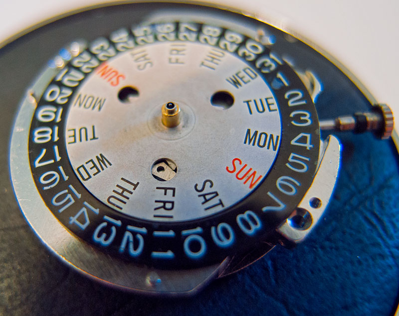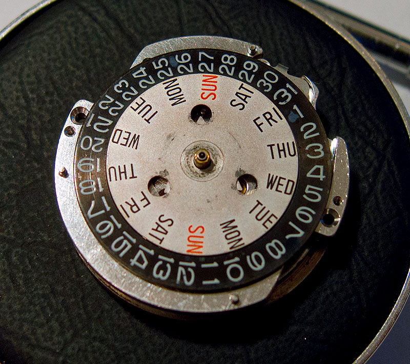 On this movement, the day and day change over more or less in tandem around midnight (day first, then date) in contrast to many of the later Seiko movements I’ve worked on which seem to complete the date changeover before the day gets its act together. We’ll see shortly how that works. Off with the day disk: