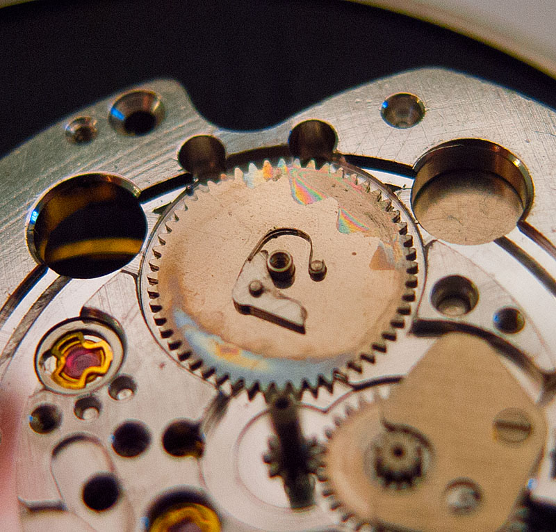 Stripping the other side of the movement was uneventful and after a thorough clean we can start to put it all back together again, paying attention to proper application of the correct amount (by my reckoning anyway*) of the correct lubricants in the proper places. Here’s the calendar side coming back together, Diafixes refitted