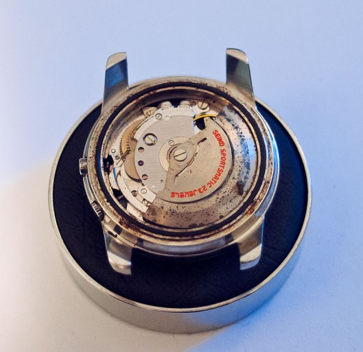 So, with the movement extracted from the case, which required destruction of the case back gasket, and the rotor removed, we can take in its general state: