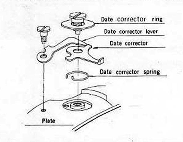 The key parts here are the date corrector lever, which moves inboard when the 3 o’clock button is depressed. This lever in turn exerts a force on a lip at the edge of the date corrector itself which moves against one of the teeth on the inner circumference of the date disk. You can probably see better how this works from this figure taken from the 7606A technical manual: