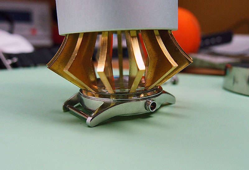 The idea here is that the crystal is first placed face down onto the sizing platform, over which the jaws of the lift are placed. The knob on top is then screwed down until the teeth grip the edges of the crystal.