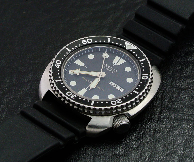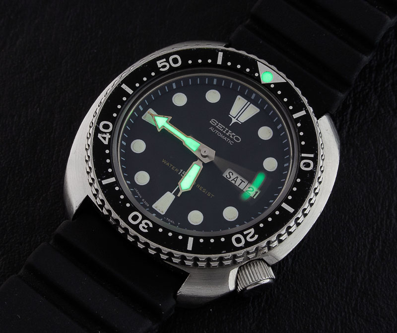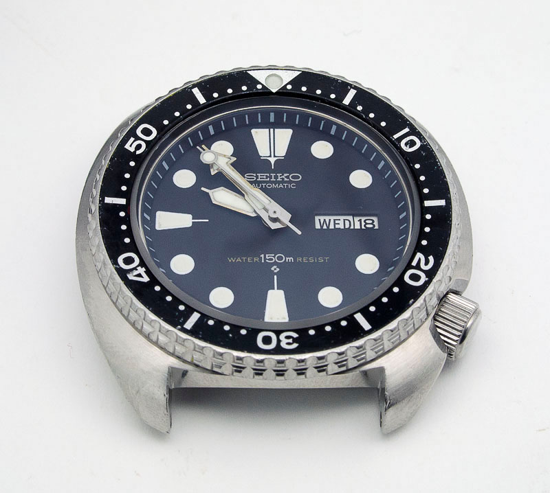 It might be worth pausing at this point to compare the slightly worn original insert, with its characteristic dished aspect and slightly granular finish, with a modern Seiko equivalent taken from an SKX007 as well a low grade aftermarket insert