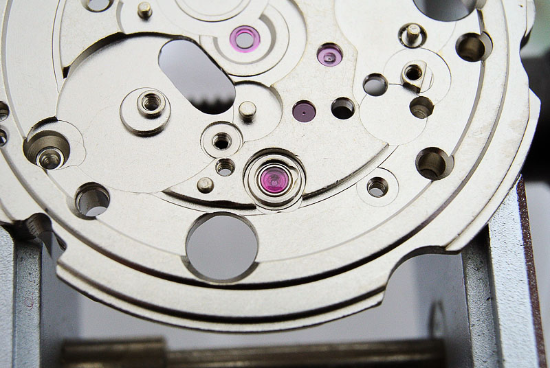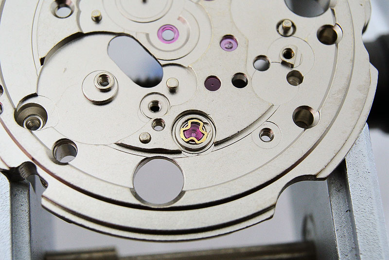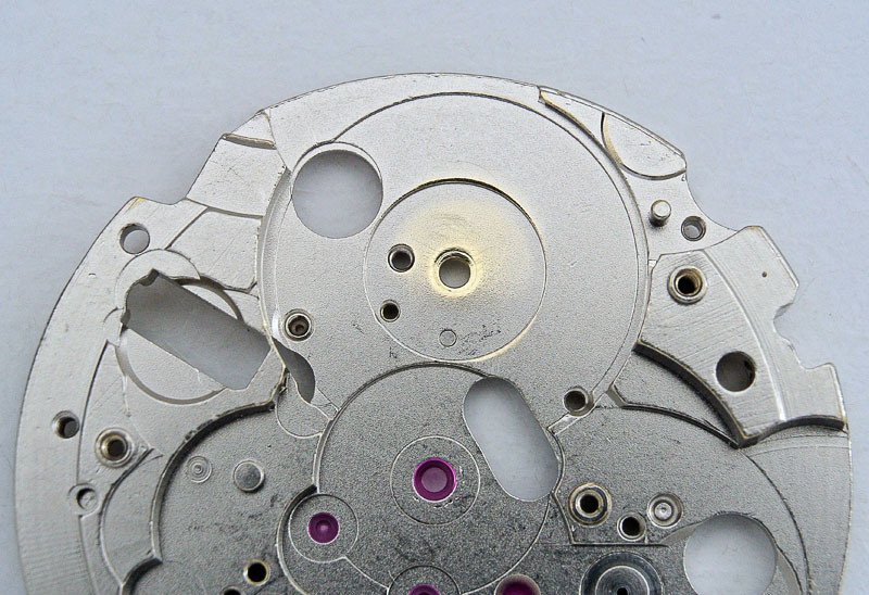 Here’s the calendar side of the movement, reassembled with the dial spacer fitted