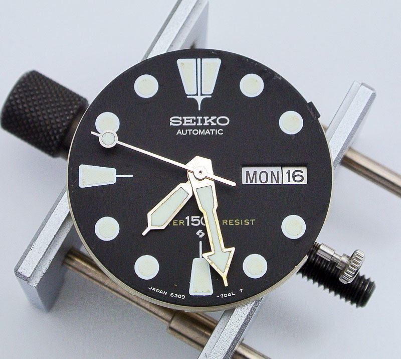 reassembly complicated only by some vacillation over whether to go for the 6319 barrel and train wheel bridge.  In the end, the decision was made for me because the third wheel from the 6319 was corroded and the watch failed to run smoothly with it fitted and so I took this as a sign to stick to a 6309 bridge and keep faith with just 17 rather than 21 jewels.  I’ll skip most of that in the interests of brevity, pausing though to consider the dial and hands once again: