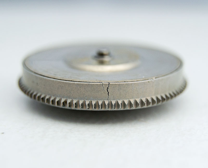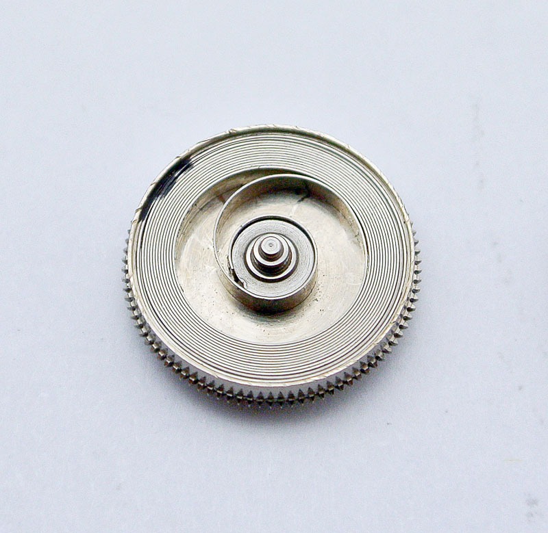 The wall of the barrel is cracked and distorted and the barrel lid does not then sit tightly enough to properly secure the mainspring within the barrel. This is an old movement and the barrel is obsolete and not available either from Cousins or Jules Borel. Fortunately, I managed to find a new one from another watch parts supplier in the UK and together with a fresh mainspring from Cousins, saved the day.