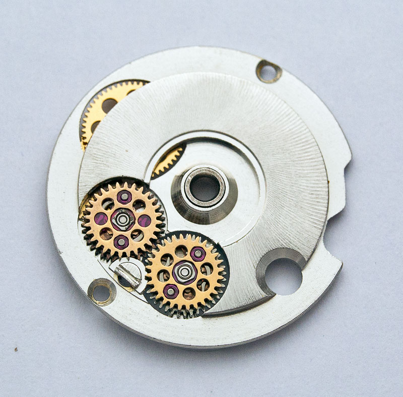 The calendar side also reveals quite a different design philosophy to the Seiko approach with the cannon pinion forming an integral part of a driving wheel which sits loosely on a fixed centre pipe, with the driving wheel itself driven by the pinion at the end of the intermediate wheel located on the other side of the movement.