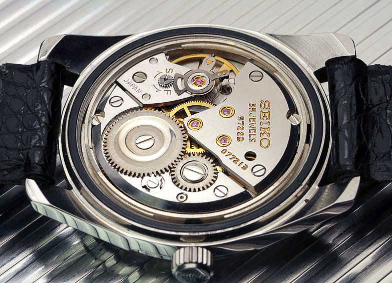That 1964 watch was the second generation Grand Seiko with the initial production run using the low beat 430 manual wind 35 jewel chronometer movement fitted with a tadpole regulator. Subsequent refinements to the movement, now renamed 5722, included fine adjustment regulation (see below).