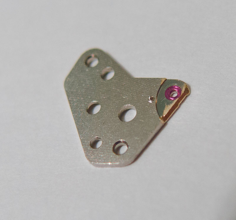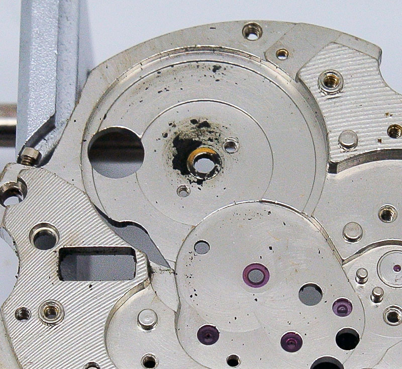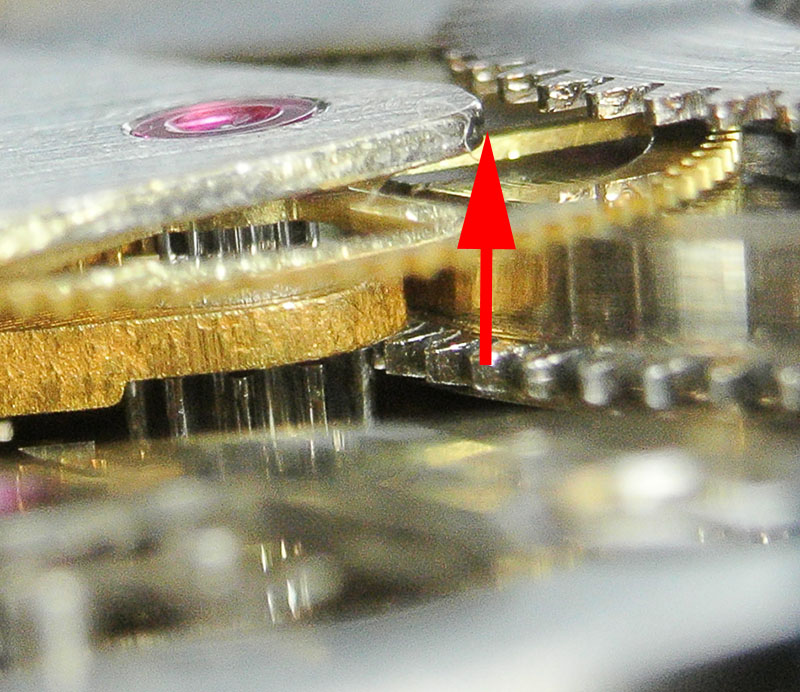 Train wheel bridge wearYou should be able to see in the photo above that the originally circular hole has acquired more of an oval aspect, with the wiggle room thus provided allowing the arbor and barrel to rock and roll during their rotational period to the extent that the teeth on the lower part of the barrel were rubbing against the underside of the centre wheel bridge. Judging from the condition of the bridge, the side shake had become so bad that the watchmaker had resorted to removing material to provide sufficient clearance to accommodate the side shake.