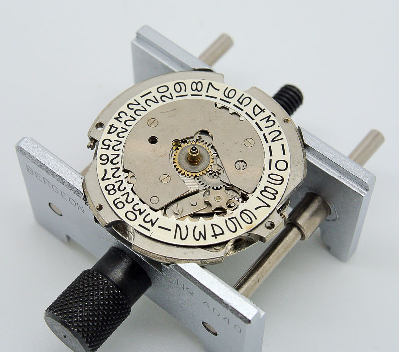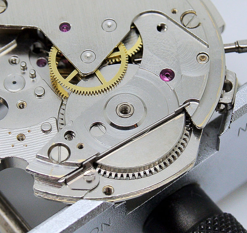Seiko 6217 barrel arborAlthough nothing much looked like it obviously needed replacing, I took the precaution nonetheless to replace the centre wheel and cannon pinion, fit a new barrel arbor and replace the setting lever and setting wheel lever complete, the latter to mitigate against a well-known potential problem with setting wheel lever wear common in all 62xx movements featuring a calendar.  Here’s a quick view of the reinvigorated movement in its new home.