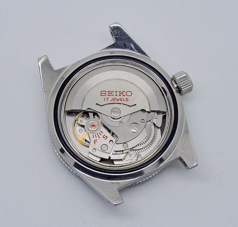 Seiko 62MAS movementFollowing a few minutes of regulation and with the mainspring at something approaching fully wound I was rather astonished to see the amplitude exceeding 300 degrees.  Currently, it is running at +1 s/d 290 degrees amplitude and 0.0 ms beat error, dial down; +5 s/d 291 degrees 0.1 ms, dial up; and +4 s/d 276 degrees 0.2 ms crown down.  Not bad for a watch born in May 1966 (coincidentally, the same birth month as the watch providing the hand-me-down).