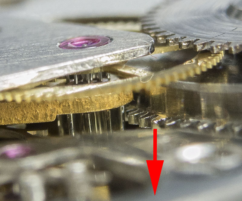 Side shake downwhilst pushing down on its outer edge lifts the teeth perilously close to the underside of the replacement centre wheel bridge, potentially slowing or even jamming the movement: