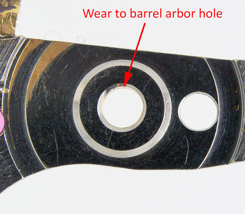 Mainplate barrel arbor wearUnappreciated at the time (although obvious if you think about it) was that in addition to a worn hole in the main plate, the barrel arbor hole in the train wheel bridge was equally worn.