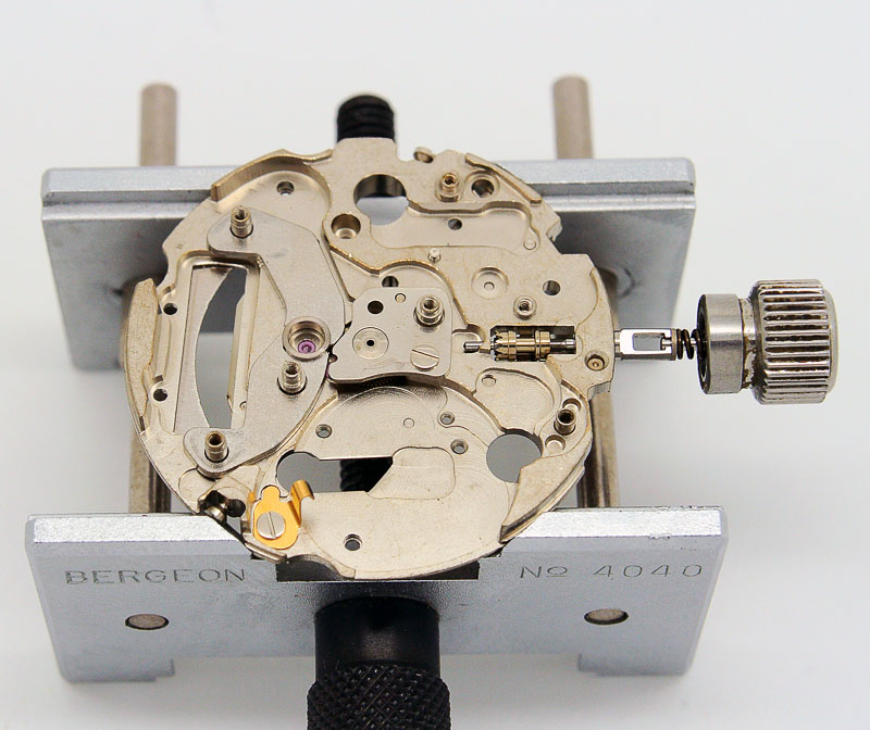 Following cleaning of all of the non-electrical movement parts in the watch cleaning machine, reassembly proceeds as follows: First up, fit and lubricate, as required, the clutch and stem followed by the setting lever, yoke and setting lever spring.