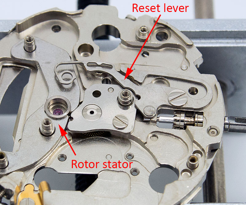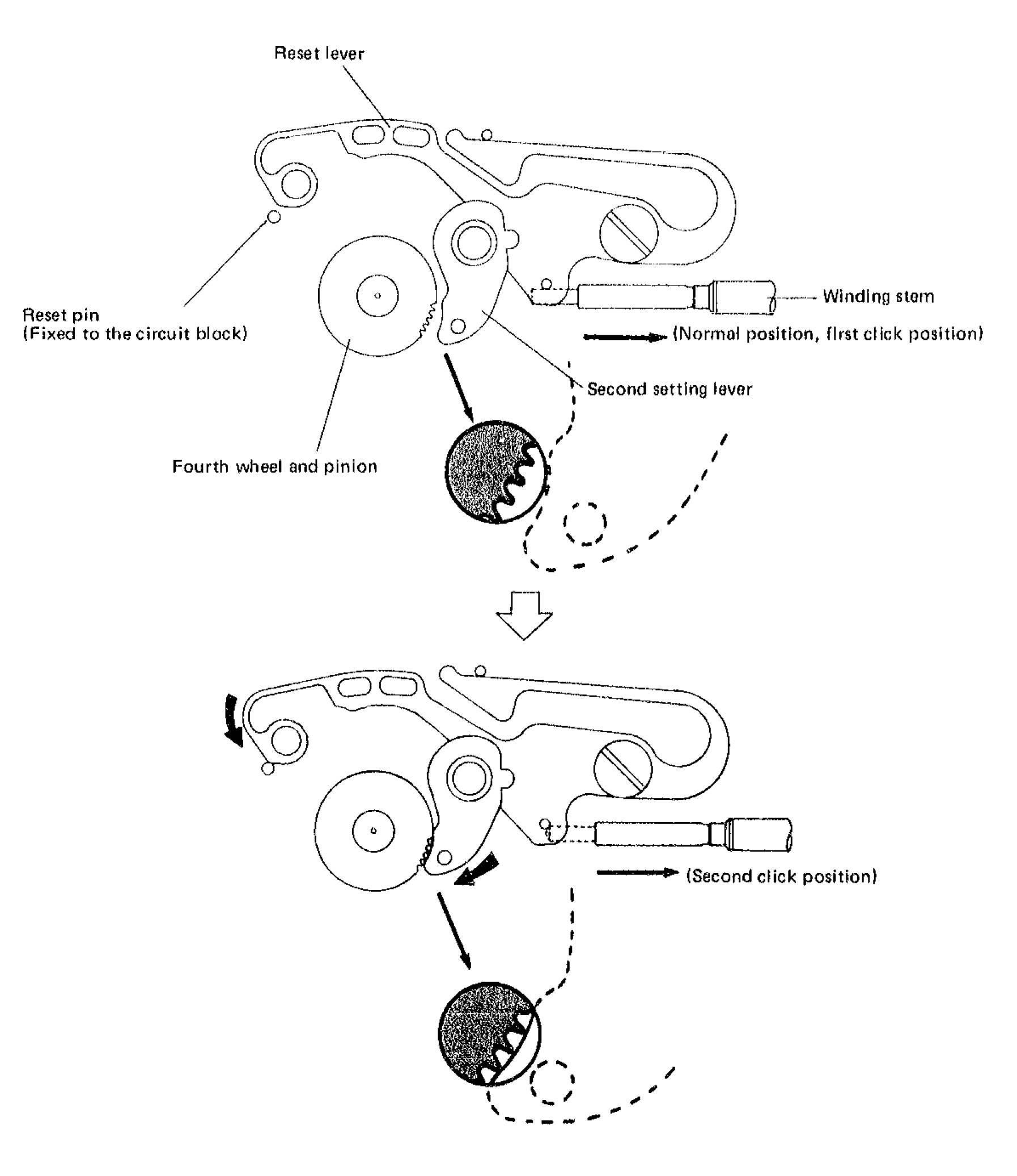 The contact of the reset lever with the reset pin stops the output signal from the circuit block but maintains current to the quartz oscillator so that it is ready to start again when the crown is pushed back to the normal position.