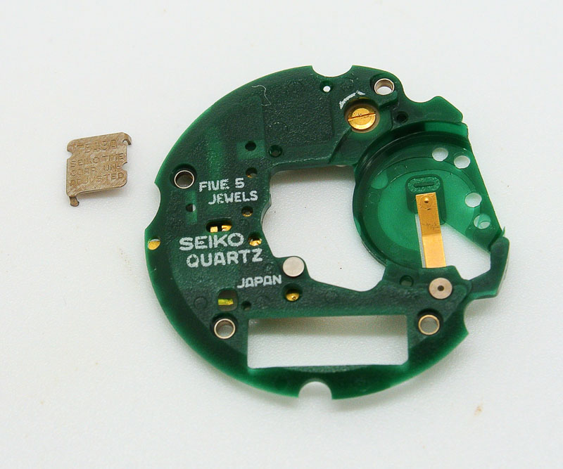 The green circuit block is secured by four screws, two of which also secure the battery-holding spring. With it removed and turned over we can see the quartz oscillator and reset pin, the latter coming into play when the crown is pulled out to the time-setting position.