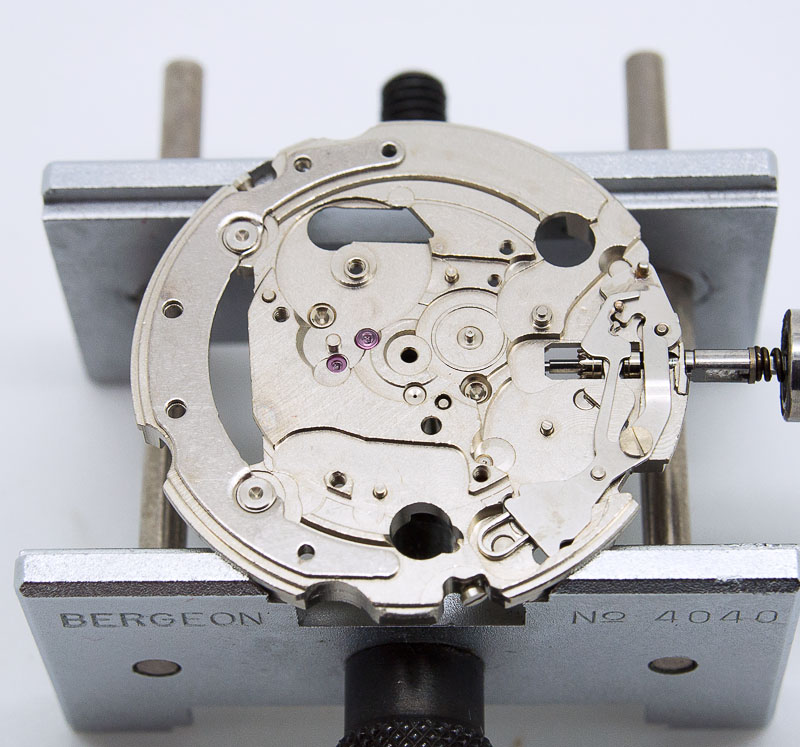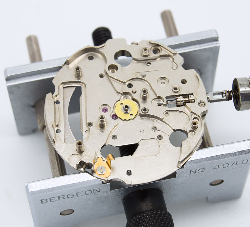 A slight hiccough follows because, having removed the crown with it in the time-setting position, the second setting lever (effectively the equivalent of a hacking lever) is sitting snugly against the fourth wheel, making extraction of any of the train wheels ill-advised.