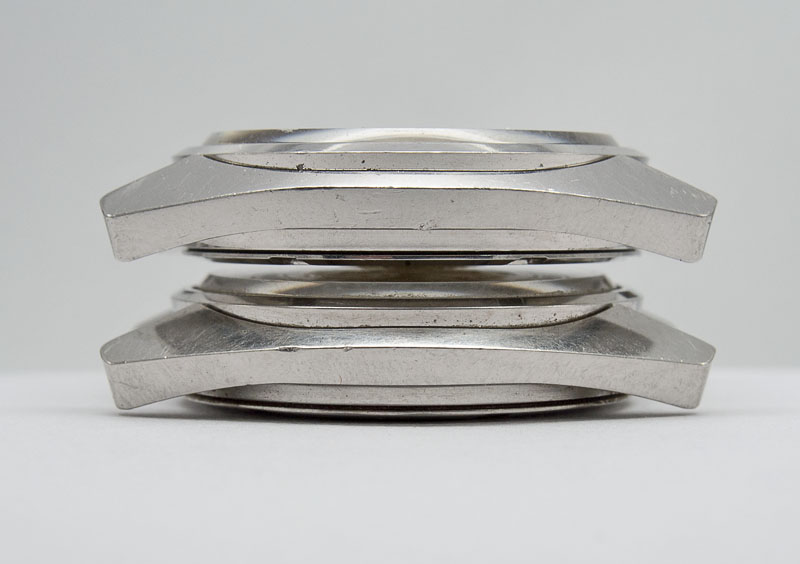 Top to tail, the two cases look essentially identical in term of shape and dimensions, with the 45-7000 having slightly more refined, less beefy lines in profile. I suspect these minor differences may just be sample variation rather than any actual difference in the case design between the two models (4502 top, 45 bottom):