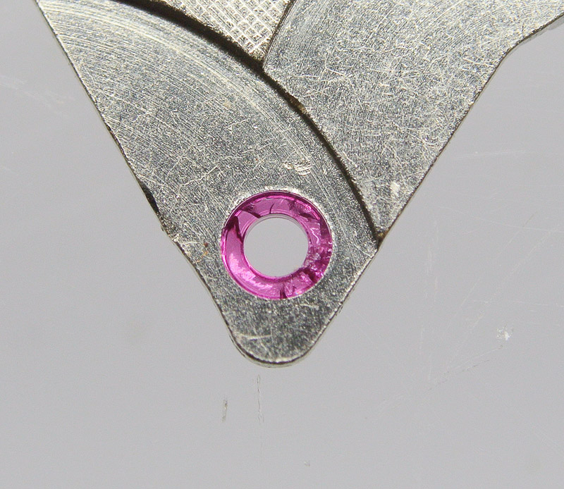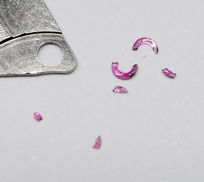 It is clearly on the verge of disintegrating: I wonder if this is why the movement refused to run? My recent decision to acquire a Seitz jeweling tool seems particularly perspicacious, having had cause to draw on its services twice in as many months. Extraction of the jewel in this case proves a great deal easier than with the 8305 described a couple of posts back but the state of the extracted jewel reveals that the only things holding it together were the hole in the bridge and the centre wheel pinion.