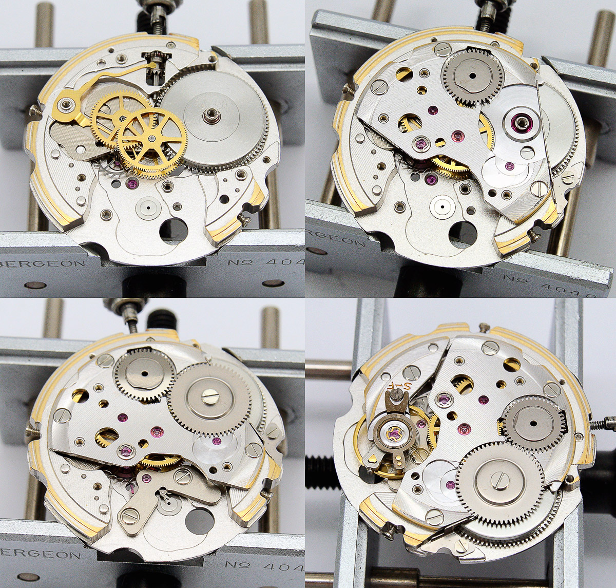 The next item of business is to convert this day/date movement into a date-only movement. This straightforwardly involves substituting the date and day driving wheel of the 6146 with a date driving wheel from a spare 6105A.