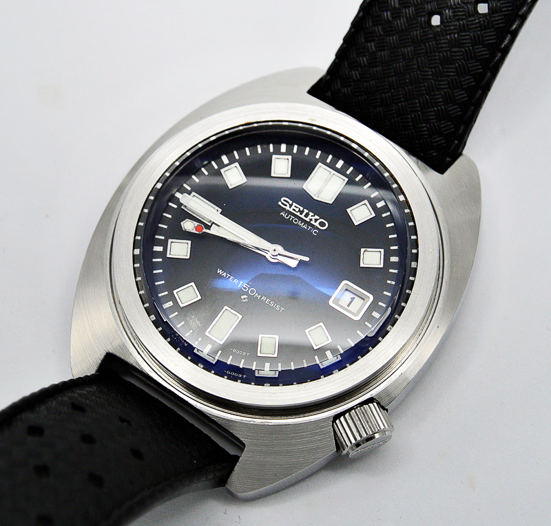 At about the same time as the first generation Seiko 6105 divers watch first made its appearance in 1968, so did a rather more aristocratic sibling whose bragging rights exceeded those of the humble 6105 in a number of departments: where the 6105 was rated at 150m, the 6159-7001 countered with 300m; where the 6105 was fitted with a 17 jewel automatic 6105A running at 21600 bph, the 6159 could boast not only a much higher jewel count but considerably higher time-keeping precision by virtue of the fact that its movement ran at 36000 bph. Into the bargain, the 6159 also hacks and hand winds.