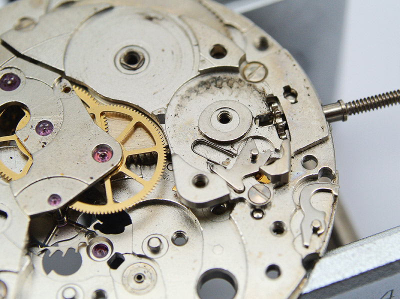 The discolouration around the barrel arbor in the photo above is a common enough sight in Seiko movements that use molybdenum barrel greases but in a Swiss movement, suggests something unpleasant within.