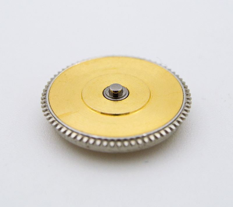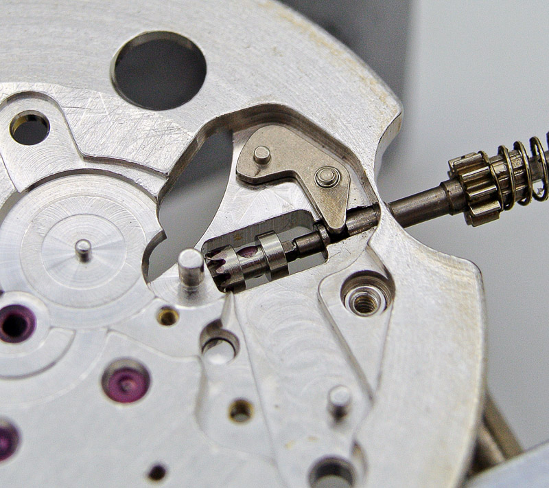 A half turn or so anticlockwise is all that is required to allow the crown and stem to be eased out, revealing the spring and cog at the crown end, there to allow rotation of the internal count-up bezel.