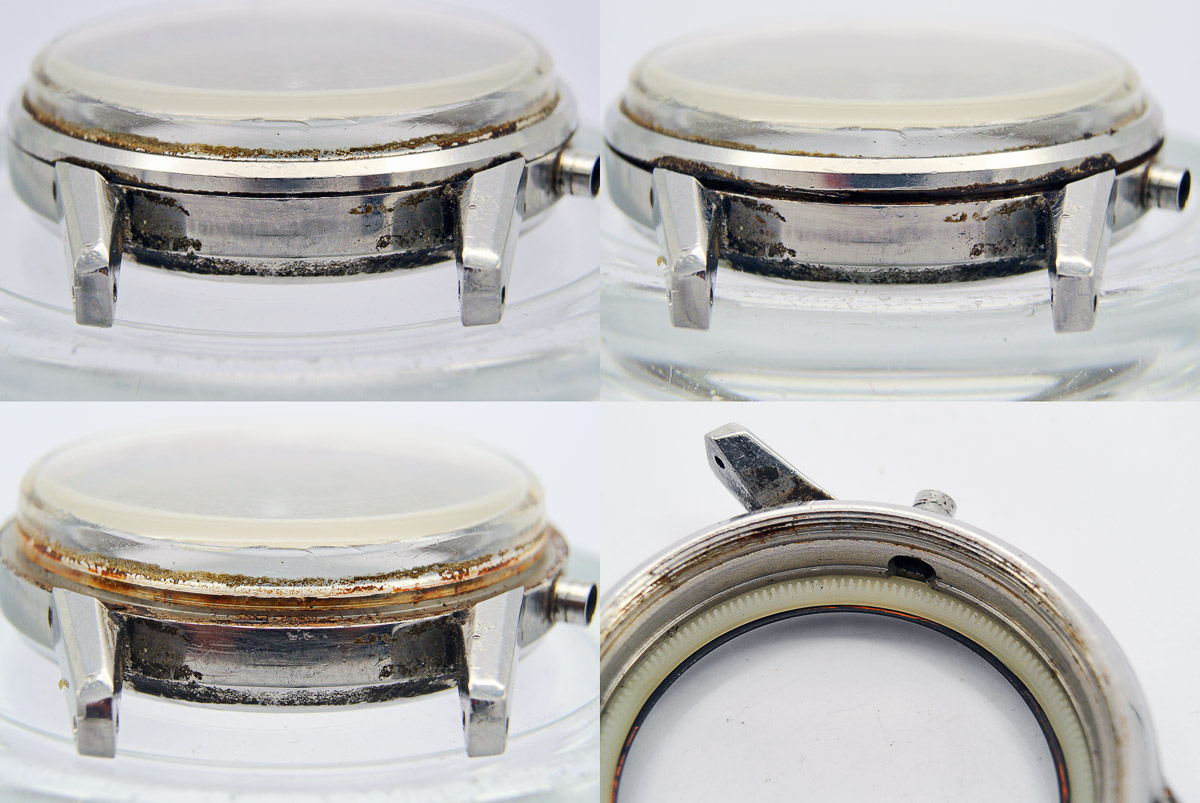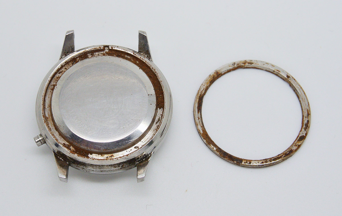 This looks like quite an esoteric approach, the main part of the case back being pressed against the gasket beneath as the separate ring is screwed down. The obvious weakness of such a design is that there are now four surfaces with the potential to trap dirt and corrode rather than just the two with a single piece screw-down back. The truth of that concern is revealed once the retaining ring is removed.