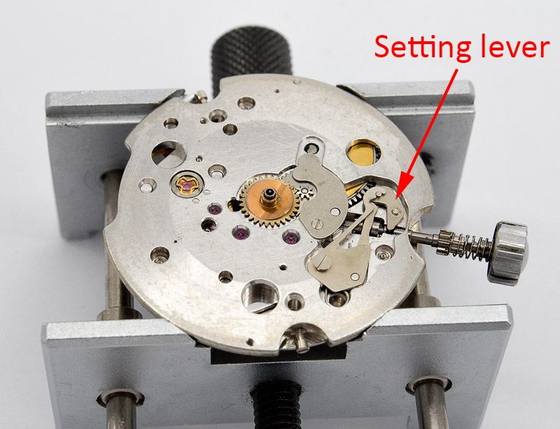 If the appearance looks familiar, that is because it is essentially the same as the later 62 series movements used throughout the Seikomatic line, 62MAS, World Timers and early automatic Grand Seikos. There are one or two notable differences though, the most obvious of which is that the setting lever is not sprung and so release of the stem is not achieved through depression of a button on the balance side but by partially unscrewing a setting lever screw (indicated in the photo below).