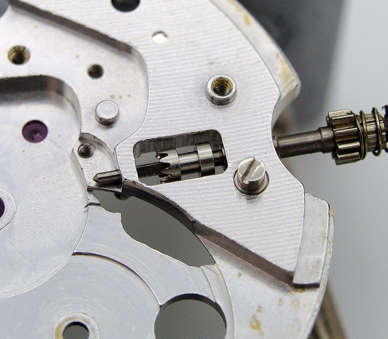 I set the dial to one side for the moment but plan to secure the marker back into place, probably using GS cement applied from the rear. With no calendar parts to concern us, the dial side of the movement looks plain and simple compared to the dater and weekdater 62 series movements I’ve become accustomed to. Note the lack of a retaining spring atop the setting lever and the threaded end of the setting lever screw poking through.
