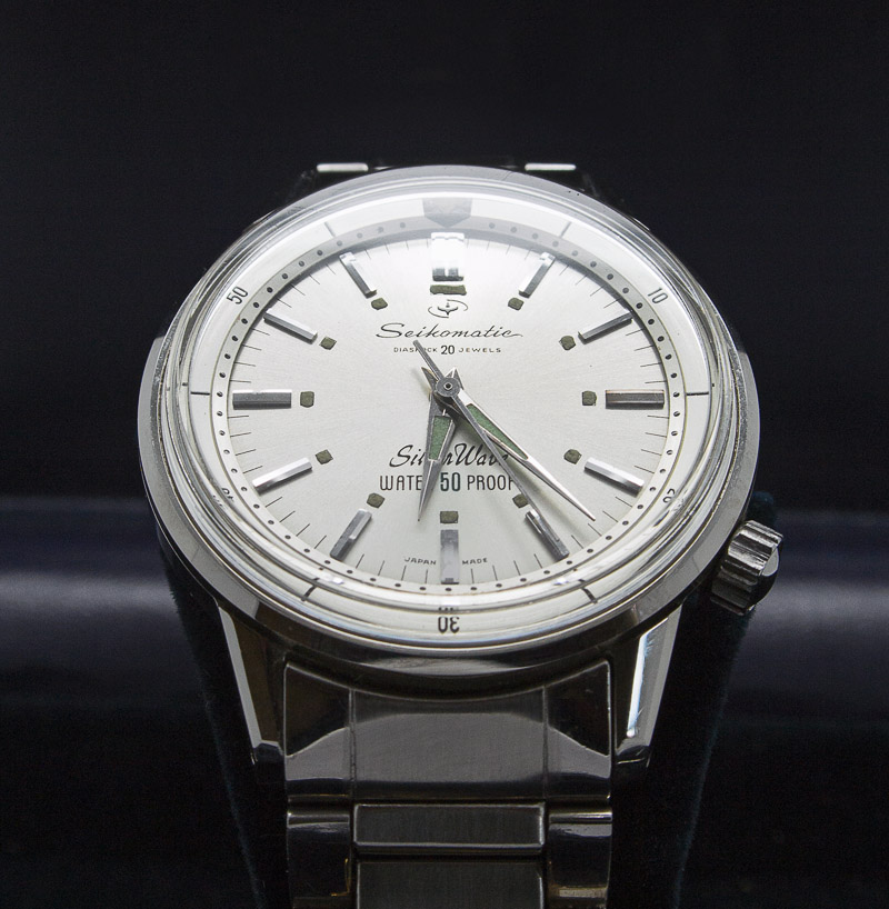 The plain silver-dialed watches included the Water 50 Proof text on the dial with Diashock 20 Jewels appearing immediately beneath the Seikomatic logo. The star burst dials omitted the Water 50 Proof markings with the Diashock 20 jewels text shifting down to below the SilverWave script. I have the sense that the star burst-dialed watches are the rarer and consequently more sought after but all combinations are beautiful and highly desirable. Incidentally, there have been some suggestions of black/black 50m combination but the only example I’ve seen looked like a cobble job with a redial. This is all getting a bit geeky and so perhaps it is time to introduce the subject of today’s post: a star burst-dialed Seikomatic Silver Wave 50m from February 1962: