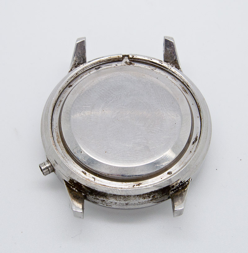 Obviously, it does not exude quite the glamour expected from our extended build-up but as we know by now, I rarely buy swans to convert to swans, preferring instead to start with the ugly ducklings. Aside from the usual exterior grime, the main obvious flaw is the partially detached marker at 7 but apart from that, cosmetically this looks like a well-used but by no means abused 54 year old watch. Turning the watch over reveals that two-part case back.