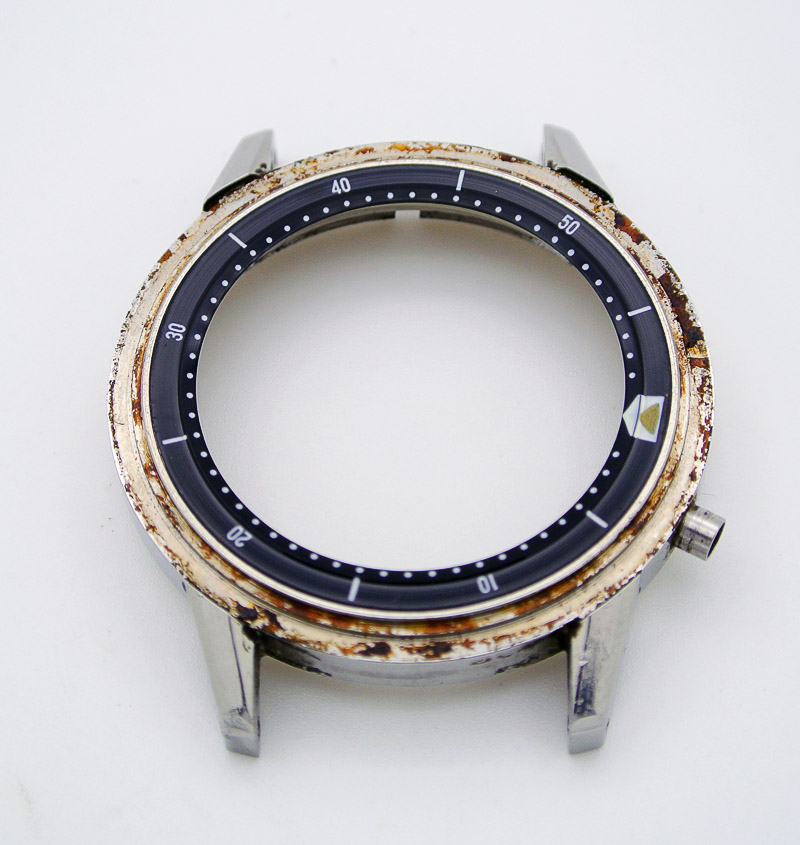 Obviously, the case itself needs a good clean but is pretty sound otherwise. The bezel comes out as a single piece where normally I might expect the upper part to come away first. This turns out to be because the plastic lower part has shrunk slightly over the years and in order for the two locating pins on the underside of the upper part to locate in the dimples in the lower part, the plastic ring has had to be distorted slightly out of true.
