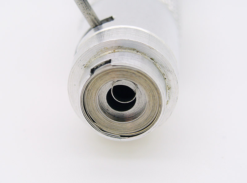 Release some of the torque and then gently reverse direction whilst slowly extracting the arbor. Sometimes the blade of a scalpel can help prevent the mainspring coming out with the winder arbor. Once it has been successfully extracted, we are left with the mainspring nicely wound into the winder drum.